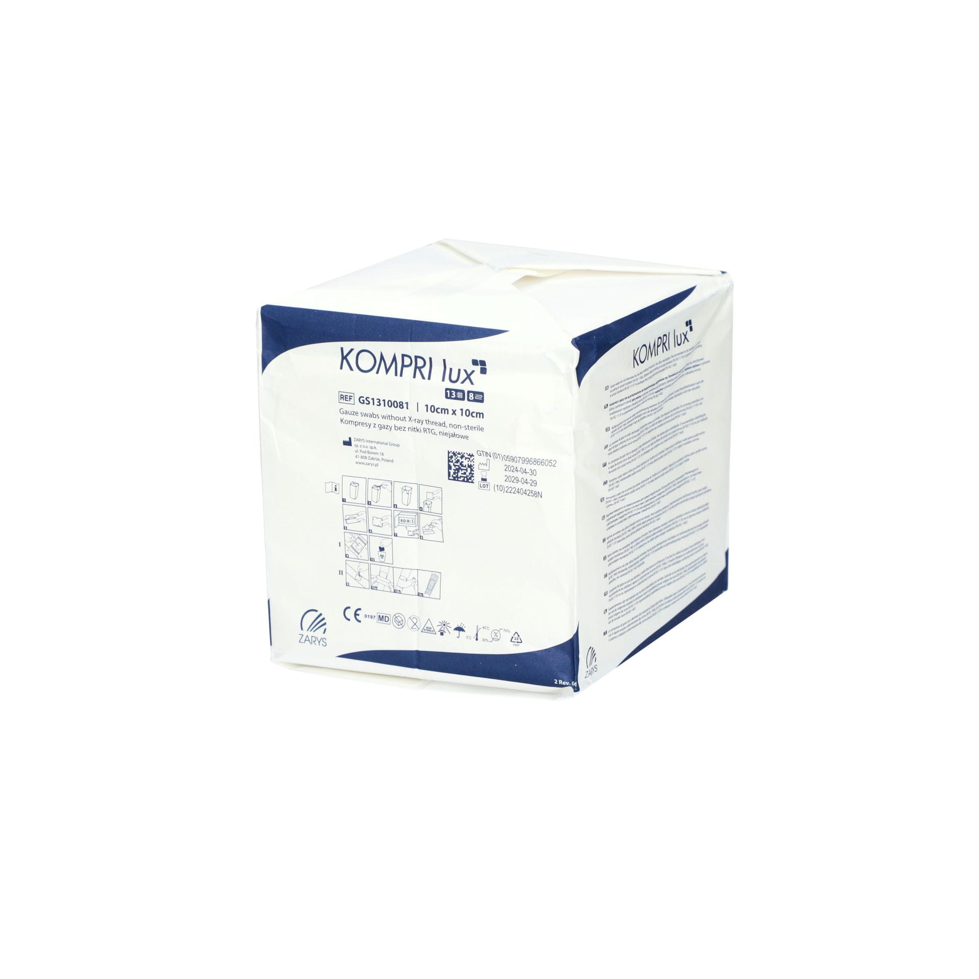 Kompresy KOMPRI lux wykonane z hydrofilowej gazy bawełnianej bielonej metodą bezchlorową z użyciem wody utlenionej. Podwójnie podwijane brzegi (tzw. składanie typu „ES”) zapobiegają wysnuwaniu się luźnych nitek. Wyrób medyczny po wyjałowieniu przeznaczony do ogólnego opatrywania ran w warunkach ambulatoryjnych, na blokach operacyjnych, oddziałach zabiegowych. Może być sterylizowany z zastosowaniem pary wodnej, tlenku etylenu lub radiacyjnie.